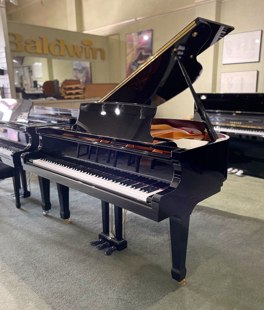 The GP148 is a beautiful baby grand piano with a bright tone and superior action that is sure to delight the most discerning pianist. The bold ebony finish and classic design is joined with with solid brass hardware and a pleasing slow close fall board to protect your keys safely when not in use.